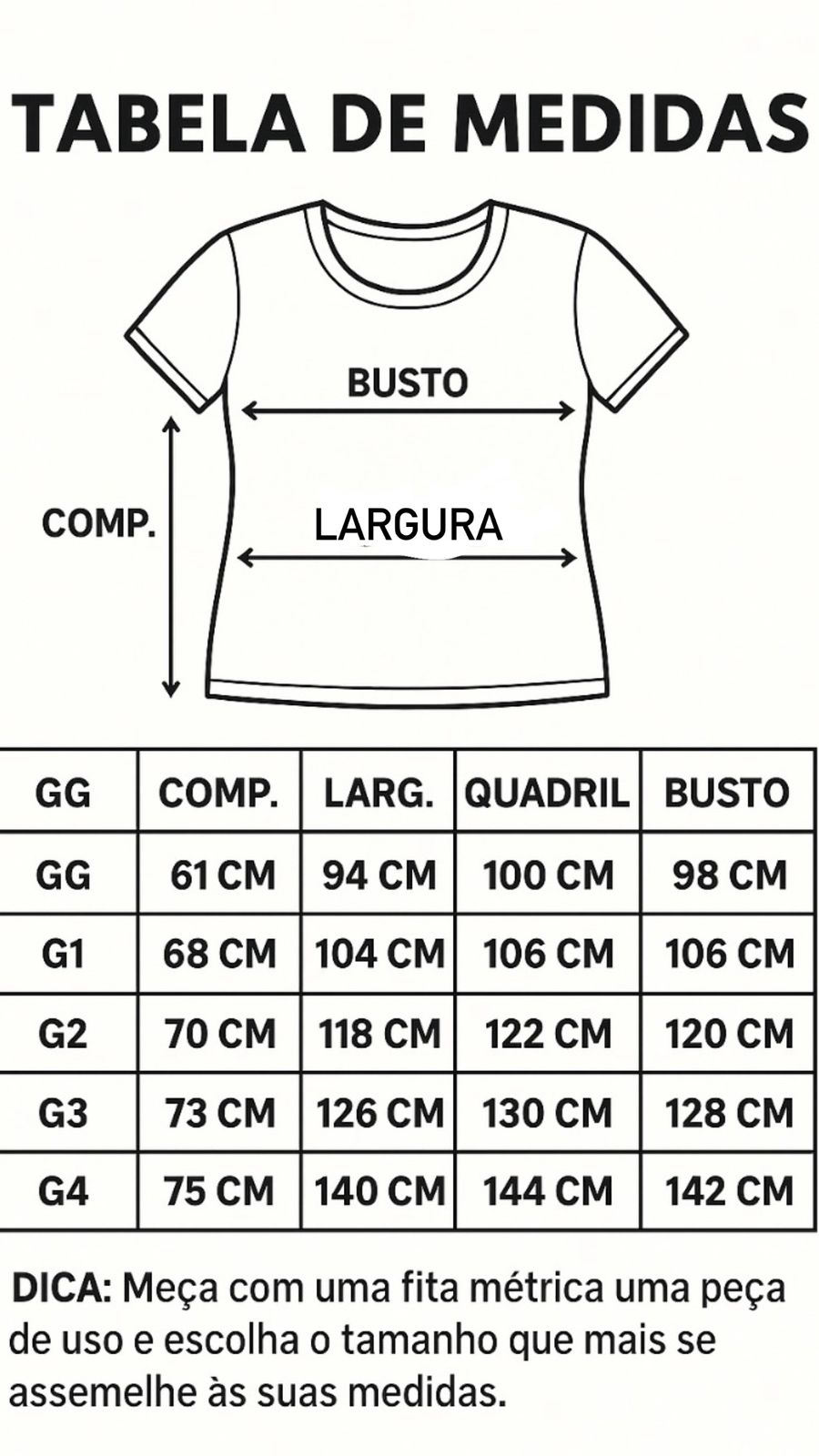 📏 Tamanhos disponíveis: G,GG, G1, G2, G3 e G4